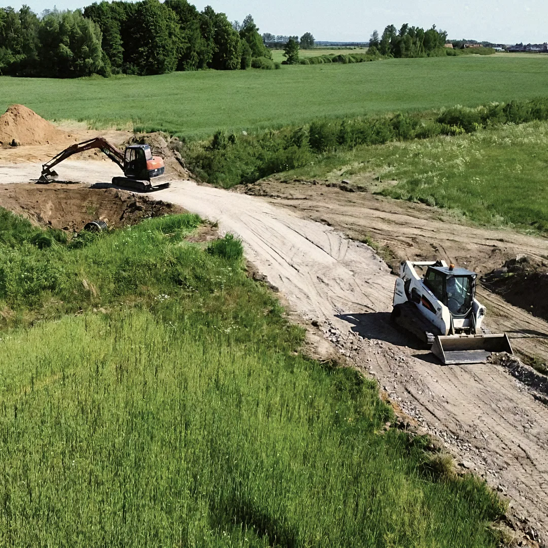 Įrengiame privažiavimus ir žvyro kelius nuo grunto paruošimo iki skaldos ar žvyro dangos užpylimo. Naudojame geotekstilę, formuojame sluoksnius, tankiname pagal normas ir užtikriname tinkamą nuolydį bei drenažą ilgalaikiam patvarumui.
